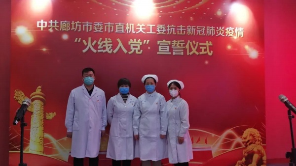3月13日上午,党委副书记冯继海同志带队,我院重症医学科赵永华、李娜、放射诊断科高倩、急诊重症医学科蔡娟娟4人参加了市直工委组织的“火线入党”宣誓仪式。