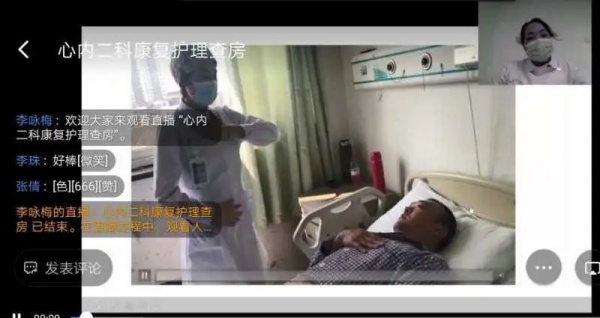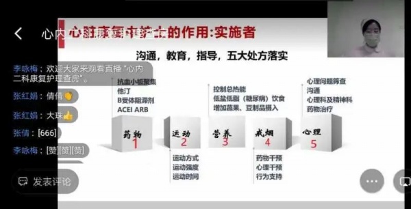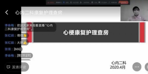 4月17日19:00,“心肌梗死康复护理查房”准时举行。查房由心内二科副护士长李咏梅主持,责任护士张倩清晰介绍了病例并提出患者的护理诊断和康复护理问题;李珠护士针对部分问题,应用根因分析法从患者的心理、术后排便方式等方面提出了改善性的护理措施,对于患者心梗术后的康复问题,直播上传了呼吸操、四肢活动指导等小视频,生动形象,简短易懂;护士朱文文图文并茂的讲述了运动康复的适应症、评估方法、指导方针及注意事项;康复专科护士在患者出院时进行了心肺评估并制定运动处方,指导患者居家运动。通过精心护理和康复指导,减少了患者的住院日,提高了患者的生活质量。最后护理部副部长张红娟对本次查房进行点评,充分肯定了心内二科的护理工作和首推创新的查房方式,希望该查房形式能够在全院展开。