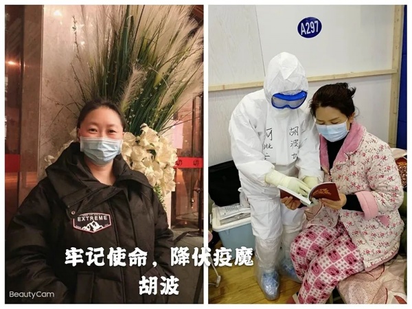 正在神经内科病房穿梭的赵珊珊接到护士长的电话:“紧急支援武汉,马上出发!”来不及多想的她在不到1小时的时间里收拾好行李来到医院集合点。2019年12月,她结束在北京协和医院半年的进修刚刚回到家,还未和家人好好享受团聚就受命奔赴抗疫一线。可珊珊却说:“武汉有疫,民族有难,驰援武汉,义不容辞。如果能尽我微薄之力也不辜负医院的培养,我的一技之长也有用武之地,不辱我‘白衣战士’、‘北京协和优秀进修生’的称号!”到达武汉的第一天,珊珊第一个剪去长发,照片中的她更加英姿飒爽,可却不敢和儿子视频,她记得儿子说过最喜欢长发女生,最喜欢长发的妈妈。爱人在和她视频后也止不住泪流,可却发来信息“人生当苦无妨,良人当归即好”,有最亲爱的他支持,无所谓美与丑。为了更好地疏导患者心理,赵珊珊所在的方舱医院开始进行一对二帮扶,她看到自己主管的李阿姨用的是老年手机不能微信,所以进仓的更多时间陪伴在李阿姨身边,出仓后常常电话聊天;廖阿姨用的是智能手机,所以她们经常视频,并且带着阿姨一起做八段锦,她用能想到一切办法来缓解阿姨们的焦虑和恐慌,听到患者们说:“我喜欢你的名字,喜欢你的声音。”“谢谢你们,其实这并不是你们应该做的!”“很累了吧,休息一会!”汗流浃背的珊珊觉得所有付出都是值得的,隔离不隔爱!