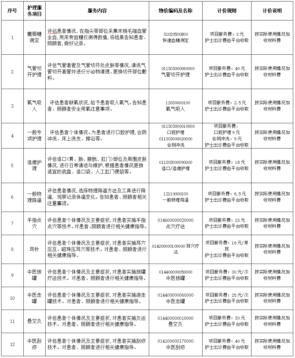 根据国家卫生健康委办公厅印发《关于进一步推进“互联网+护理服务”试点工作的通知》,河北省卫生健康委、河北省中医药管理局印发《河北省“互联网+护理服务”试点工作实施方案》,廊坊市卫生健康委员会办公室印发《廊坊市“互联网+护理服务”试点工作推进实施方案》的通知等文件精神,我院本着公平、合法和诚信的原则,根据服务项目成本和市场情况,依法合理制定服务项目价格,按照文件要求,在执行前一周进行公示, 现公示如下: