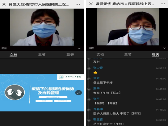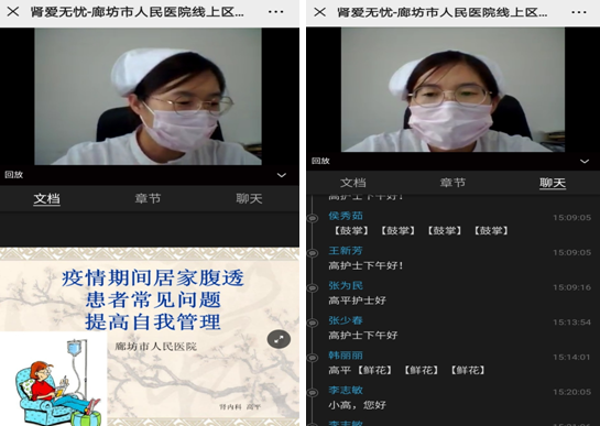 腹透专职护士高平以《疫情下腹透患者自我管理与防护》为题,向肾友们作了深入浅出的知识讲座。就肾友们独自完成治疗中遇到的常见问题在线进行了解答及经验分享。