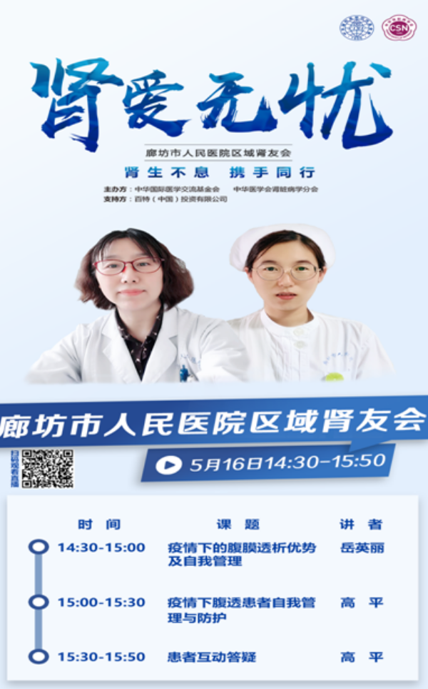 为提高尿毒症患者的生活质量和生存率,帮助尿毒症患者进行科学的病症防治和自我管理,5月16日,市人民医院肾内科举办了“腹膜透析”线上肾友会,廊坊区域肾脏患者通过在线收看直播的方式参与讨论交流。肾内科主任岳英丽、腹透专职护士高平线上答疑解惑,会议全程流畅活跃,肾友们倾心交谈,积极互动,气氛活跃。