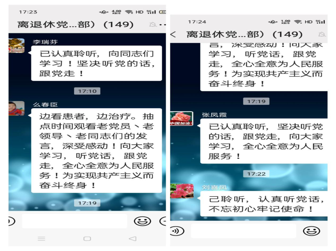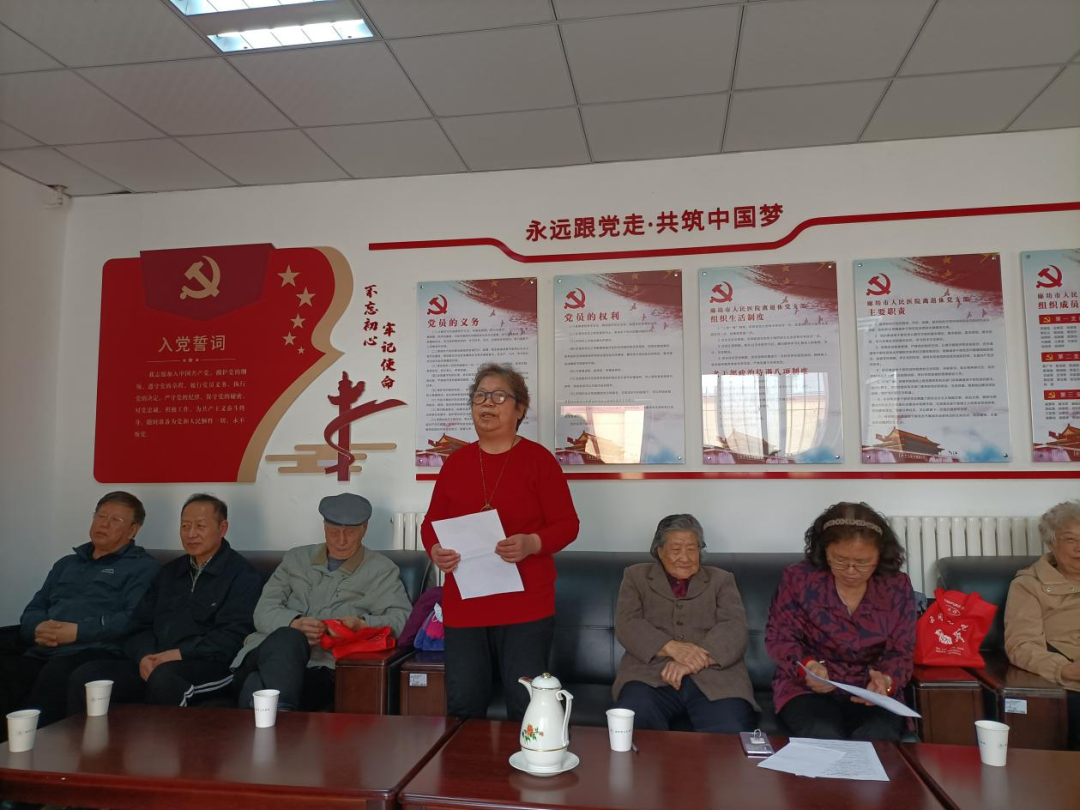答题结束后,老党员代表贾洪兰、郝文荣、万金秀、王宝萍等将自己学习党史的深刻体会与自己的感想相结合,从中国共产党百年前只有50多名党员的一个弱小的组织谈到如今有着9100多万名党员的世界上最大的政党,从党的艰难发展历程谈到如今党领导下的国富民强,从自己儿时生活的贫困谈到如今晚年的幸福生活......只有共产党才能有新中国,才能有强大的中国,他们把党比作母亲,用真诚质朴的语言抒发了自己对党的无限忠诚和无尽热爱。大家一致表示,一定要守初心,担使命,铭记党的教导,不忘党的恩情,随时听从党召唤,为共产主义奋斗终身,做好新时代的共产党员。