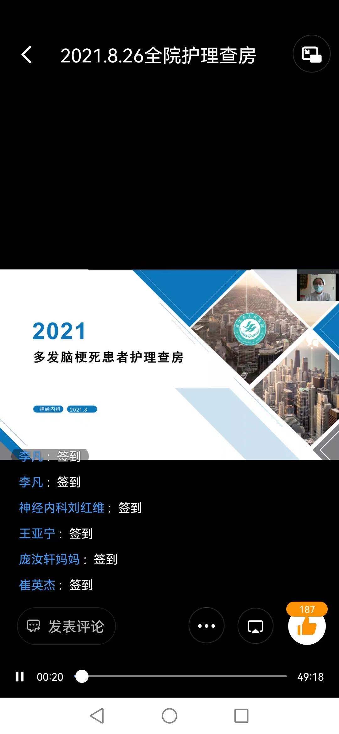 根据护理部的工作计划,第三季度全院护理业务查房在神经内科进行。由于疫情防控的要求,本次查房采用线上直播与现场相结合形式进行。主题为多发脑梗死患者的护理,神经内科副护士长高玉敬主持,主治医师何涛及4名责任护士共同完成。