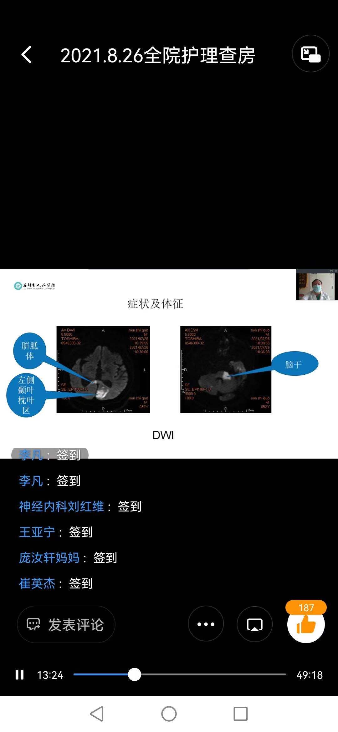 查房中,神经内科责任护士孟晓远进行了患者的病例汇报,主治医师何涛为大家介绍了脑梗死的相关知识,图文并茂的形式让大家对脑梗死的影像学检查和症状体征及危险因素有了更清晰的认识;责任护士通过对该患者全面的护理评估,提出了存在及潜在的护理诊断,制定了详尽的、个性化的护理措施。通过查阅相关指南、共识及文献,针对有效的口腔护理液选择、尿失禁护理干预、进食安全管理,疫情常态下延续护理服务等内容展开了深入的讨论分析。