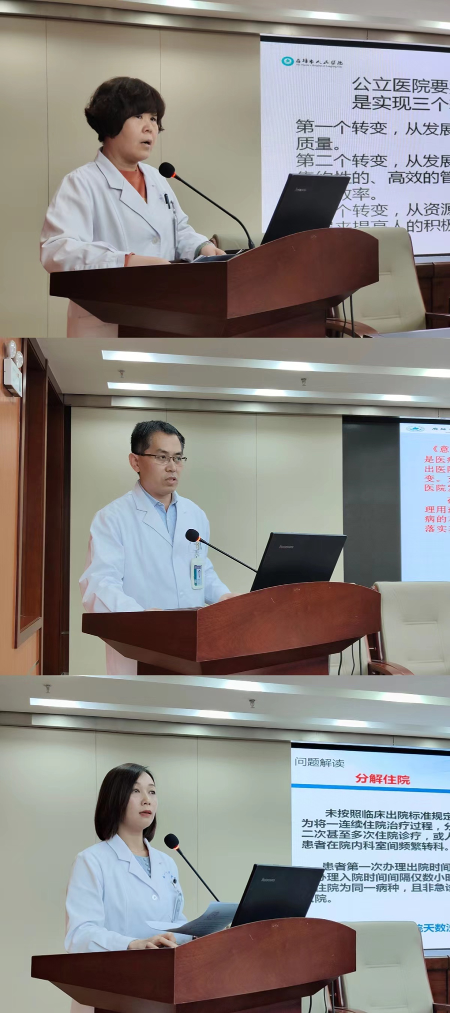 会议分别听取运营管理部部长张莉关于公立医院绩效考核结果的汇报;医务部部长邢国宽关于医疗质量工作的汇报;医保办主任尤倩关于省医保飞检问题反馈及DIP预结算情况的汇报。