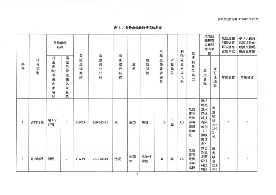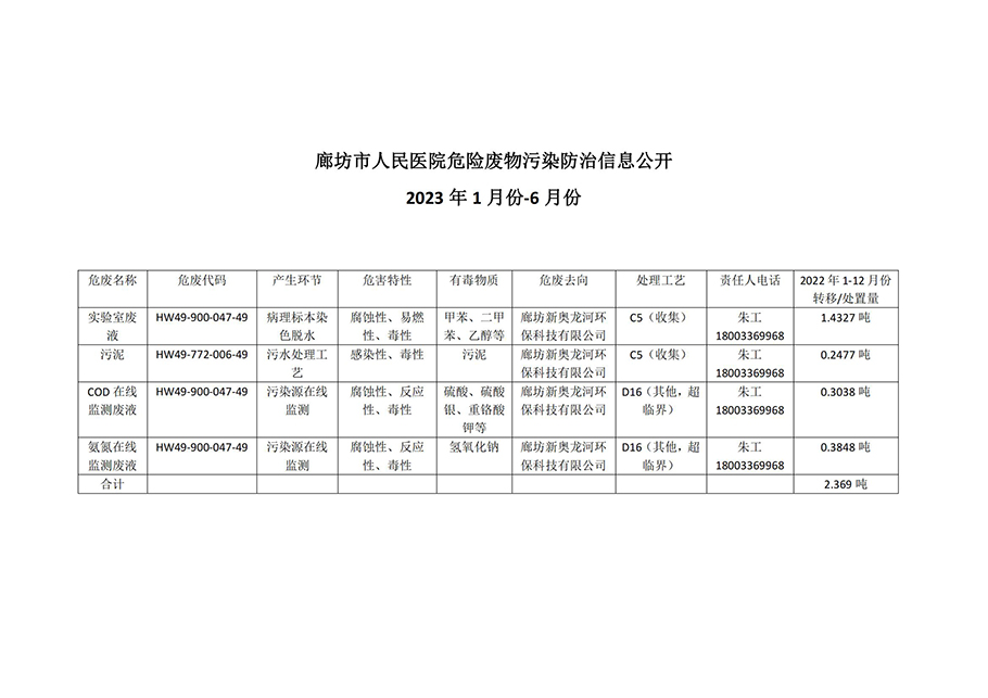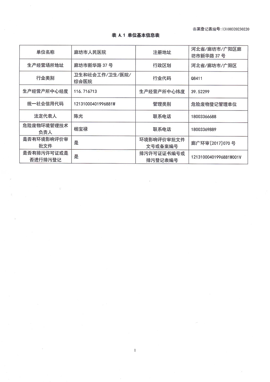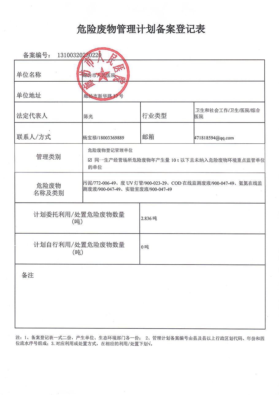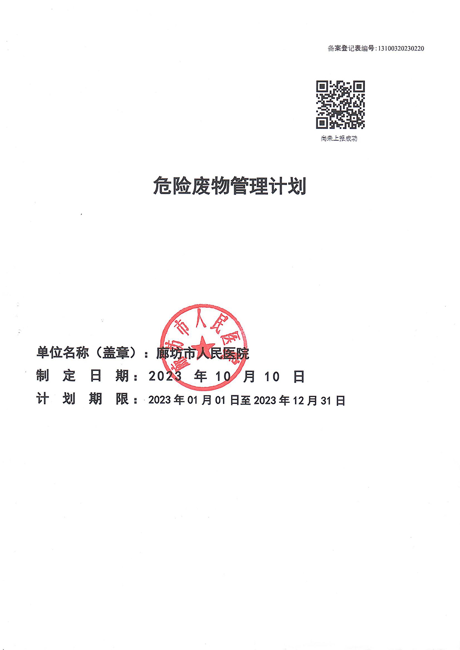 廊坊市人民医院2023年度危险废物管理计划备案登记表