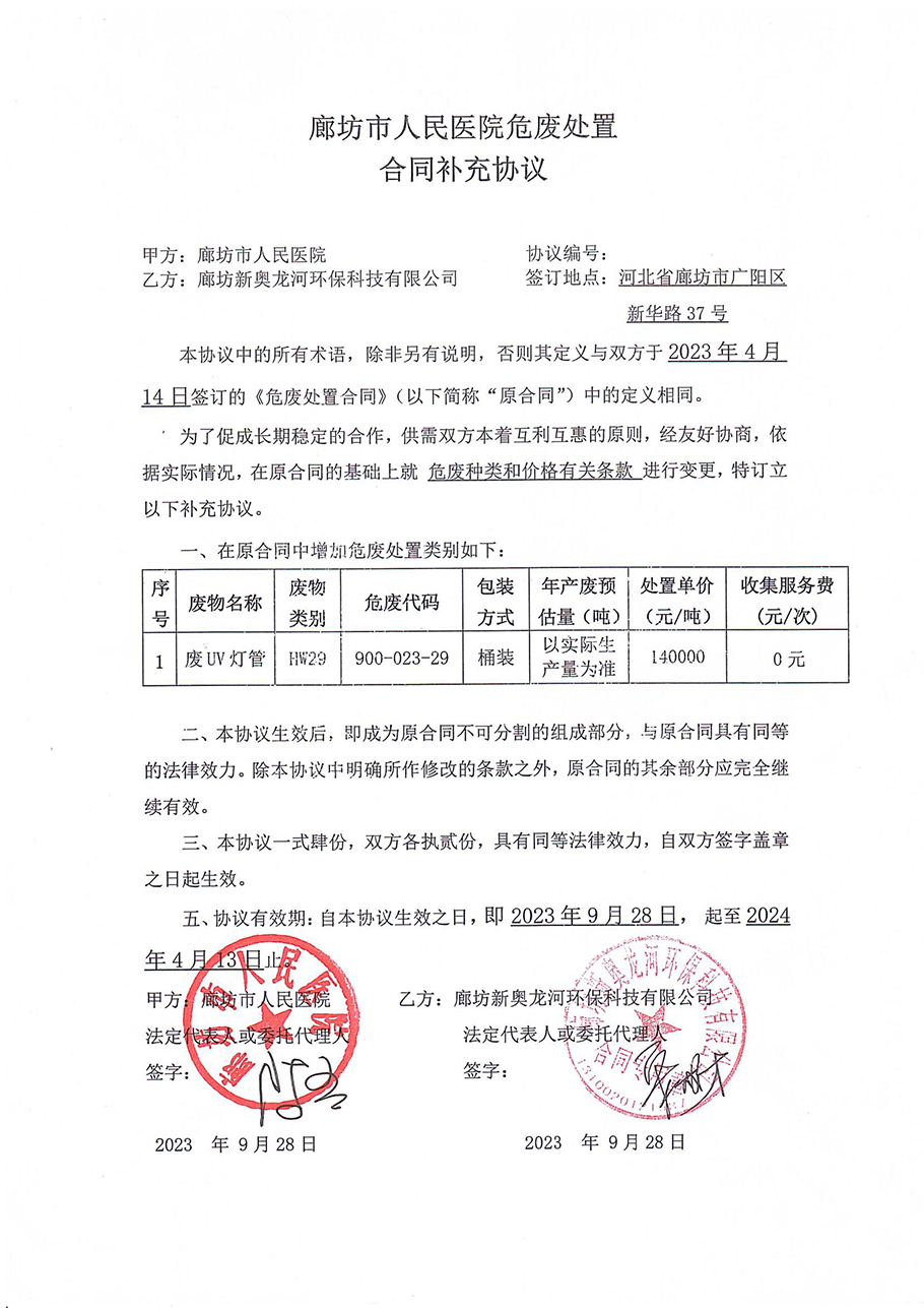 上图为《廊坊市人民医院危废处置合同补充条款》