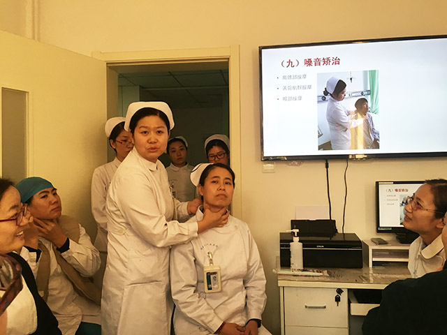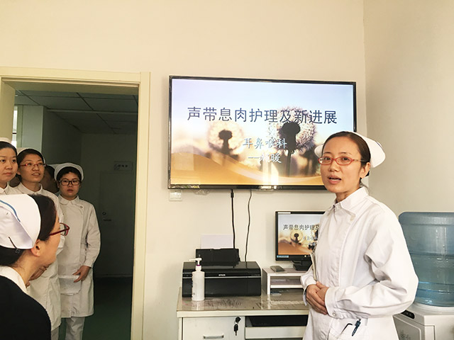 本次查房亮点是嗓音矫治工作的开展实施。耳鼻喉科今年先后两次派出医护人员到北京及天津专项学习嗓音矫治,并在科内开办嗓音矫治课堂,教会患者正确的发音方式,呼吸与发音的协调性以及腹式呼吸的重要性等等。本次查房就由经过培训的医护人员现场演示,教会在场人员正确发音方式及保护嗓音的小技巧。在整个查房过程中,提问、解答、讨论、示范,环环相扣,形式新颖独特,内容丰富,理论联系实际,大大提高了大家的学习热情,丰富了查房工作的技巧,提升了护理人员的专业技术水平,达到很好的培训效果。