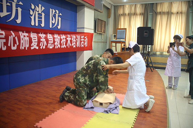 当危险或者灾难来临时,先出现的往往是一线的消防官兵,他们才是抓住性命的第一道关口,所以急救知识才显得尤为重要。为了提高消防官兵现场救治能力,5月11日,我院技能老师在护理部姬文英科护士长的带领下,来到廊坊公安消防支队东安路中队,为消防官兵们讲解院前急救――心肺复苏技术。通过详细而通俗的讲解、专业培训老师的示范,官兵们两两配合练习心肺复苏,护理老师们给予一对一纠正,并结合实际工作中可能遇到的问题进行了演练,对官兵们提出的比如遇到溺水、烟熏、窒息等如何处理给予了专业的解答。