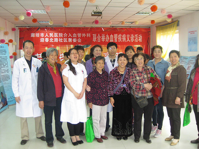 5月12日上午,介入血管外科医护人员与廊坊市迎春北路社区居委会联合举办了外周血管疾病义诊活动。医护人员为大家讲解了静脉曲张和糖尿病足相关知识。通俗的讲解和生动的图片让社区叔叔阿姨们受益匪浅。当糖尿病的一张图片被投射到屏幕上时,一位大娘惊讶的表情让医护人员深深感受到普及健康知识的重要性和人们渴望获得健康知识的心情。会后主任、护士长又耐心细致地解答了大爷大娘们提出的问题。“护士节不休息来为我们宣传科普知识,深受感动”这是一位现场大妈的真情流露。
