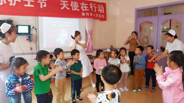 为了此次活动的顺利开展,护士与幼儿园老师多次沟通,详细落实每个细节,希望孩子们学以致用,整个流程也是改了又改,目的是为了孩子们更容易接受和掌握。5月5日正值世界手卫生日,护士们来到小朋友中间,和孩子们共同学习了六部洗手法。