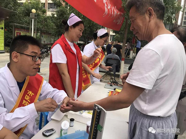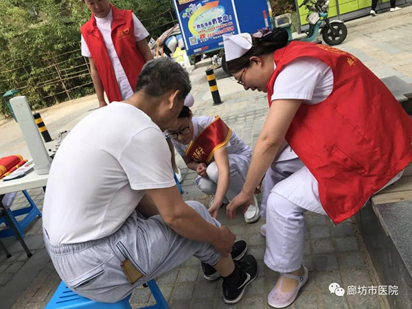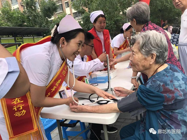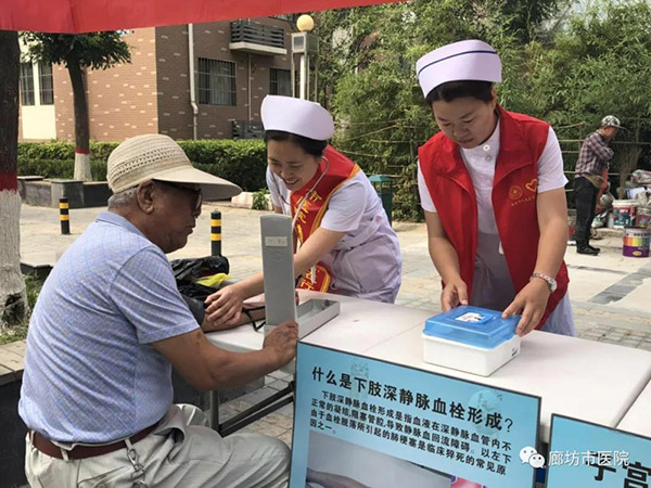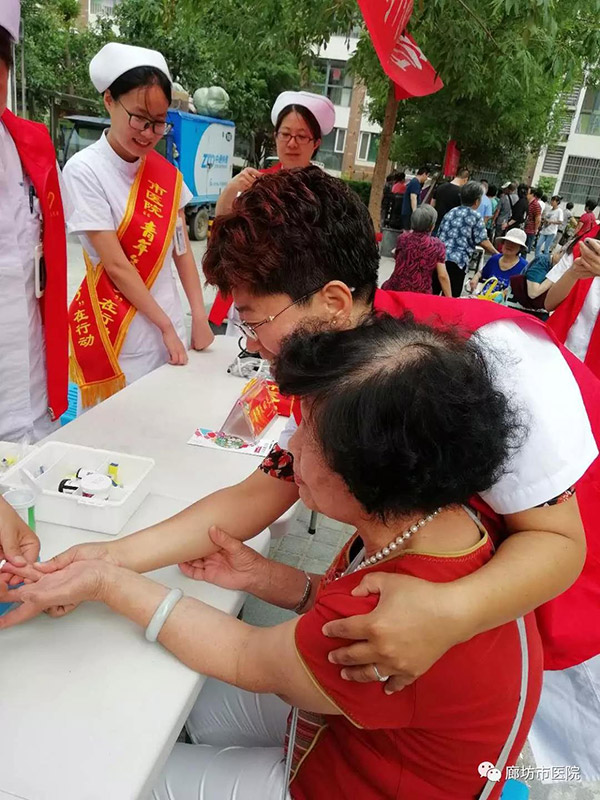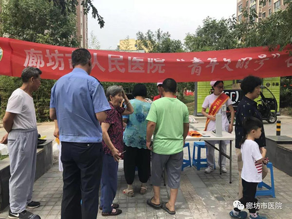 为积极响应全市创城工作的号召,充分展现“青年文明号”示范带头作用,6月16日上午,廊坊市人民医院院办室联合团委组织“青年文明号”科室介入血管外科、重症医学科8名志愿者携带小型医疗设备及宣传资料走进馨钻界社区开展义诊活动,为社区居民进行疾病咨询和健康检查。