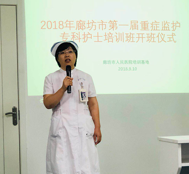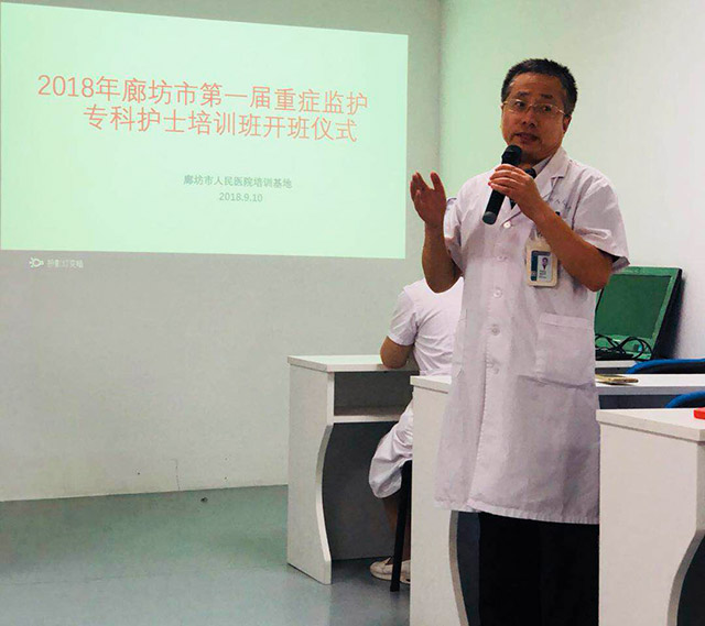2018年9月10日,廊坊市第一届重症监护专科护士培训班在廊坊市人民医院培训中心隆重召开,廊坊市护理质控中心主任、廊坊市人民医院护理部部长樊爱玲、副部长尤倩,重症医学科主任李绍臣,重症专业委员会主委、重症医学科护士长李红,全院重症专业委员会成员及本班学员共50余人参会。