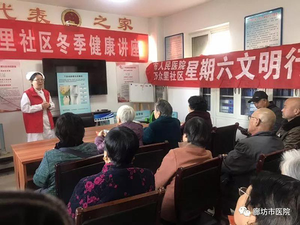 为增强社区居民的健康水平和保健意识,让居民在自家门口就能享受到免费的医疗保健服务,11月24日,廊坊市人民医院联合万众里居委会走进馨钻界社区开展“星期六文明行动”健康知识讲座。