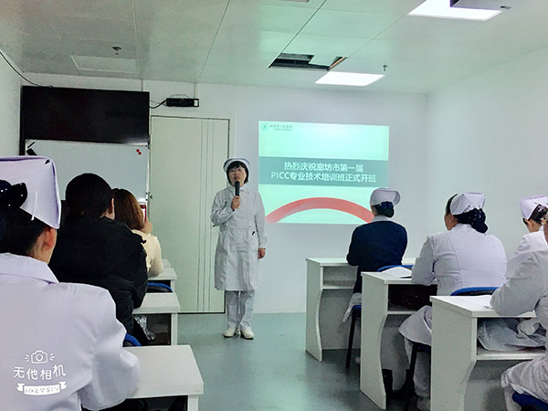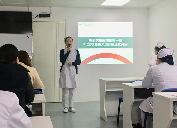 开班仪式由廊坊市人民医院尤倩副部长主持。首先,廊坊市护理质控中心主任、市人民医院护理部部长樊爱玲发表了讲话,对培训班提出了期望和要求,要严格按国家专科护士培训大纲要求授学,规范PICC专业培训技术标准,切实加强专科护理,改善护理服务,努力为人民群众提供安全、优质的护理服务。尤倩副部长就廊坊市人民医院PICC培训基地的建立、专科护理队伍建设和护士专业素质培养等方面进行了授课。市医院静疗专委会主委殷青介绍了课程安排及培训重点,希望学员们在学习中互通有无、取长补短、学有所成,促进全市各兄弟医院静脉输液治疗事业的共同发展。
