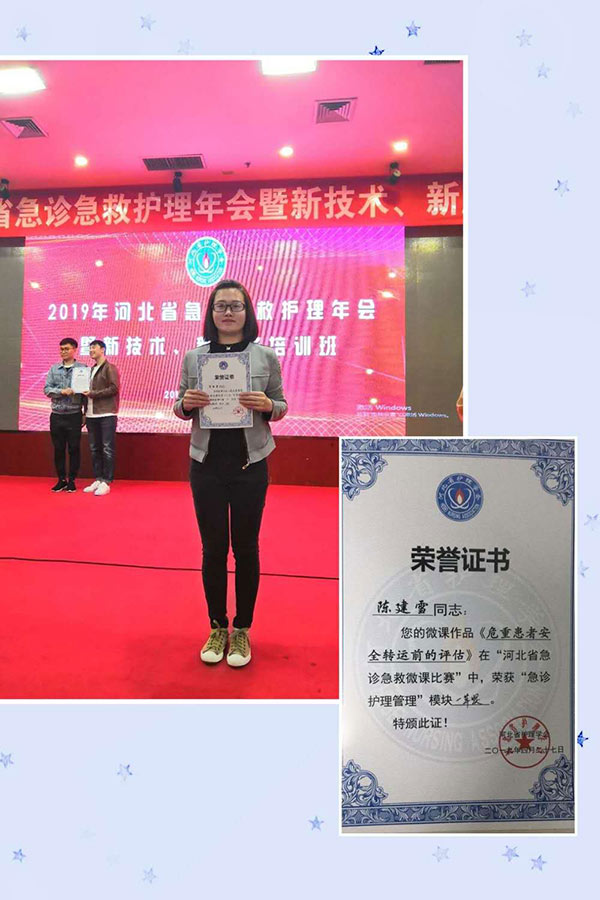 为促进急诊护理学科发展,提高急诊科护士抢救、管理危重症患者的能力和水平,提高护理质量,河北省护理学会于2019年4月27-28日举办了全省急诊急救专业大赛。经过前期两轮初赛、复赛,来自全省各市医院的58名选手进入了最后决赛。比赛分四个模块举行,通过现场激烈角逐,我院参赛选手急诊科黄颖森、急诊重症医学科陈建雪脱颖而出,荣获了两项全省一等奖,急诊科王金平荣获全省二等奖,为我院和廊坊市护理界赢得了荣耀,一等奖获得者还将代表河北省参加全国比赛!