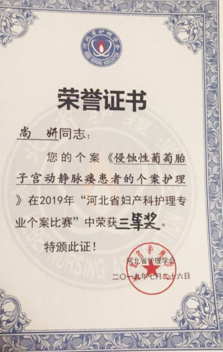 日,在“河北省妇产科护理专业个案比赛”中,我院妇科尚妍护士创作的《侵蚀性葡萄胎动静脉瘘患者的个案护理》从