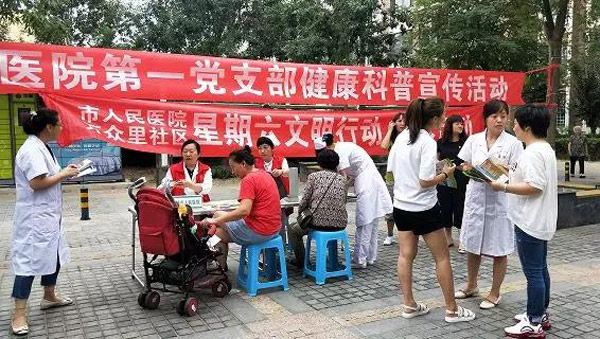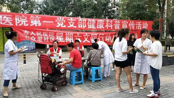 7月26日上午,市人民医院机关第一党支部党员与预防保健科、心二科的医务人员,来到万众里社区开展了“健康科普宣传”和“文明行动”的活动。