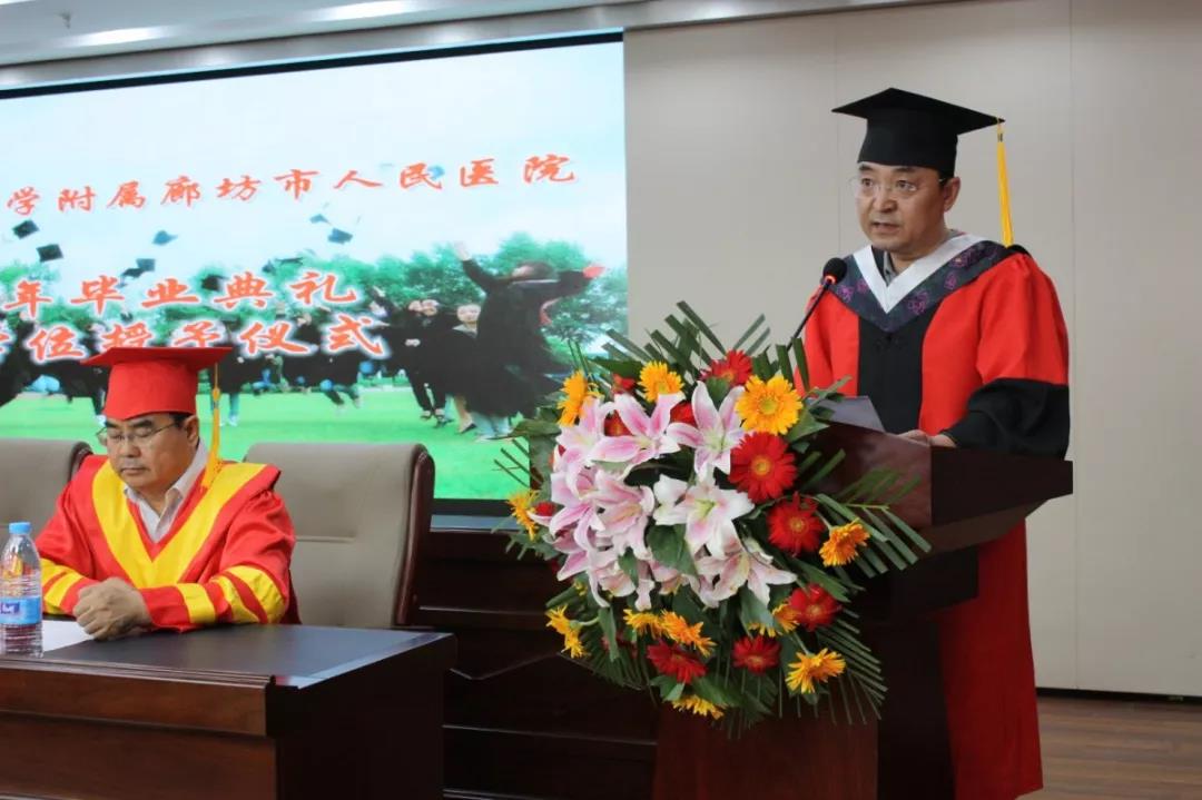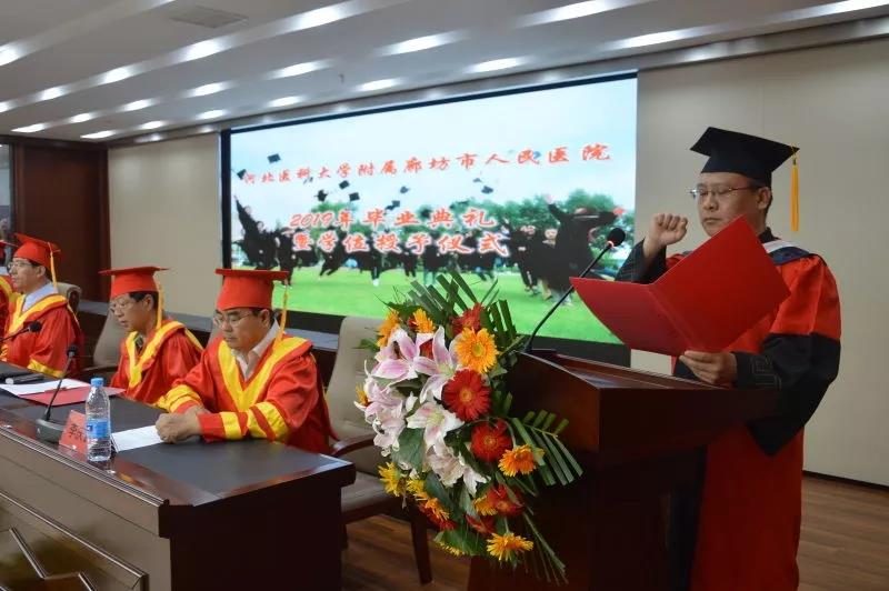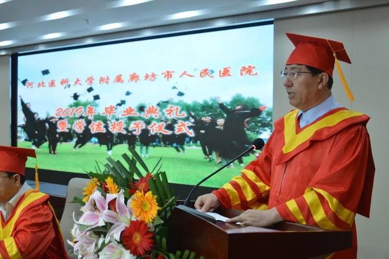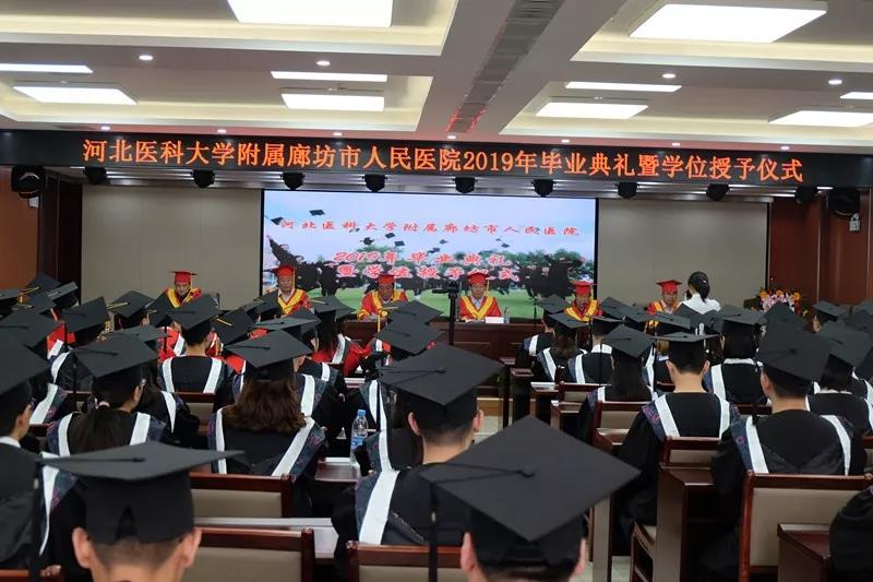 6月25日下午,河北医科大学附属廊坊市人民医院2019年毕业典礼暨学位授予仪式隆重举行。河北医科大学副校长牛春雨、院党委书记凌少奎、河北医科大学教务处副处长剧亚崇、党委副书记冯继海、总会计师李庆坤等领导出席。各教研室主任、教师代表和全体毕业生参加了典礼,典礼仪式由副院长高登鹏主持。典礼仪式在雄壮的国歌声中开始。