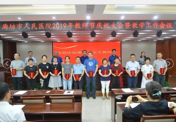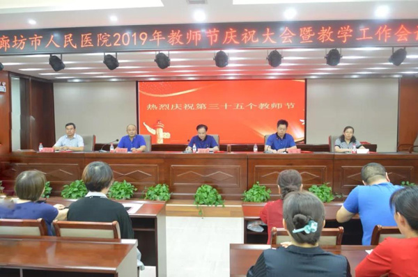 9月10日,我院召开廊坊市人民医院2019年教师节庆祝大会暨教学工作会议。副院长高登鹏、胡建忠、总会计师李庆昆、纪委书记刘洁和各科室主任、各教研室主任、副主任、秘书、教学部相关人员及学生代表参加了会议。会议由副院长陈光主持